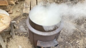 味噌を仕込むときは外で火をたき、大釜で大豆をゆでます。